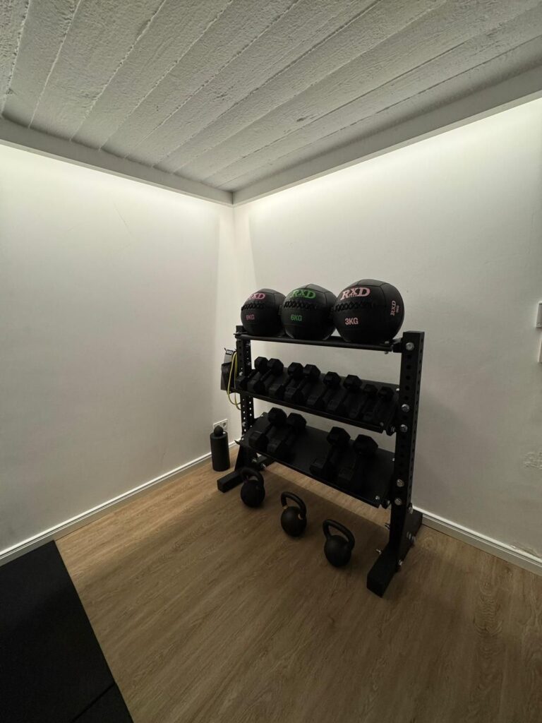 Voor functionele oefeningen leveren we kettlebells, medicine balls en een verstelbare trainingsbank. Voeg een trainingsmat en foam rollers toe voor warming-up en herstel. Slimme opbergoplossingen houden je ruimte strak en overzichtelijk.